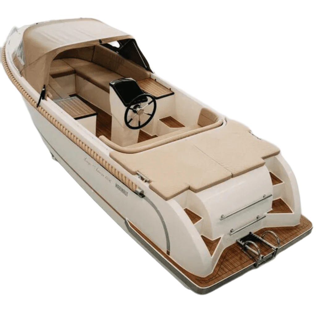 Het is een fijne gezinsboot geschikt voor lange tochten over meren en plassen. Achterop is een ruim zonnedek en in de boot kunnen 6 tot 8 personen comfortabel zitten.